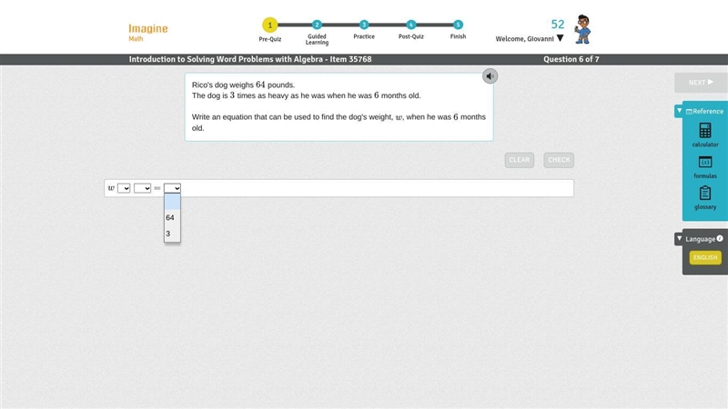 Let x be the dog's weight when he was 6 months old. Since the dog's weight is 3 times as heavy now, we can say: w = 3x But we also know that the current weight of the dog is 64 pounds, so we can substitute w = 64: 64 = 3x Dividing both sides by 3, we get: x = 21.33 Therefore, the equation to find the dog's weight when he was 6 months old is: x = 21.33