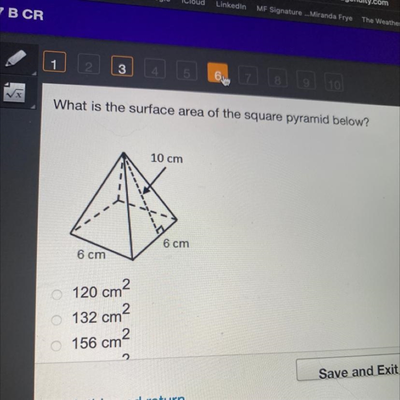 The surface area of a square pyramid is a² + 2al if a = the length of the side of the base of the pyramid and l = the height of each triangle. a would be equal to 6 in this case, since it is the length of the side of the base, and l would be 10 because it is the height of each triangle.