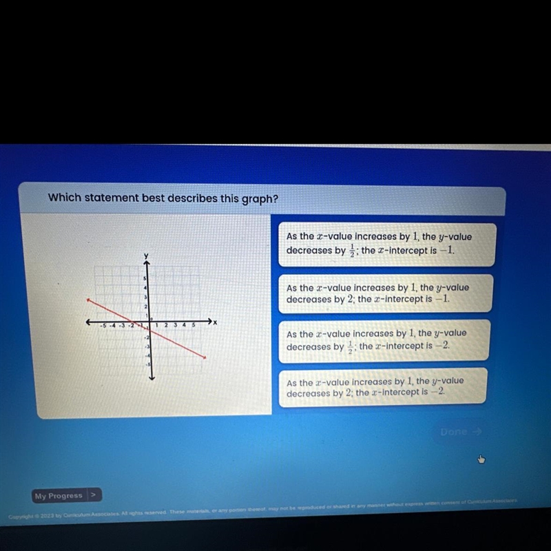 the x intercept is where the graph crosses. The x axis. Here the slope is negative one half. Count rise over run between two points. Use the ones on the grid