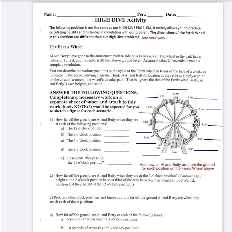 Answer:a) The 12 o'clock position: Al and Betty are 35 feet above the ground when they are at the 12 o'clock position on the Ferris wheel.