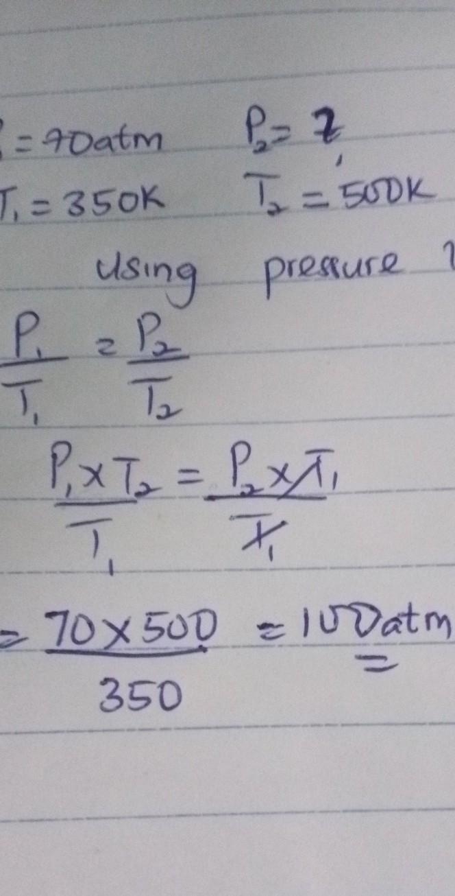 A gas has an initial pressure and temperature of 70 atmospheric pressure and 350 Kelvin, what is the pressure of a gas at 500 Kelvin