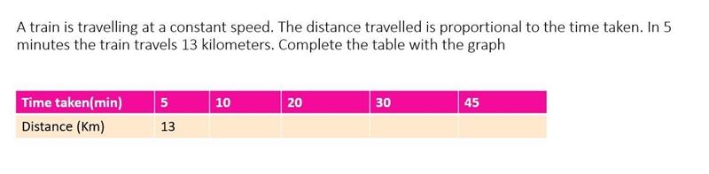 A train is travelling at a constant speed. The distance travelled is proportional to the time taken. In 5 minutes the train travels 13 kilometers. Complete the table with the graph.