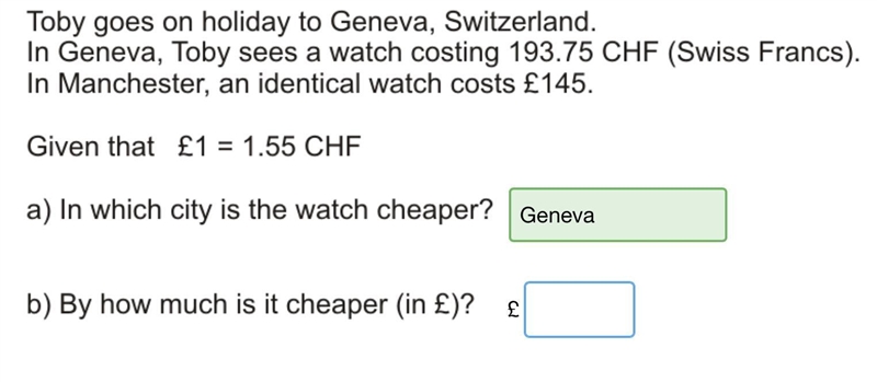 Answer to part (b) = The watch in Geneva costs £20 less than the watch in Manchester.