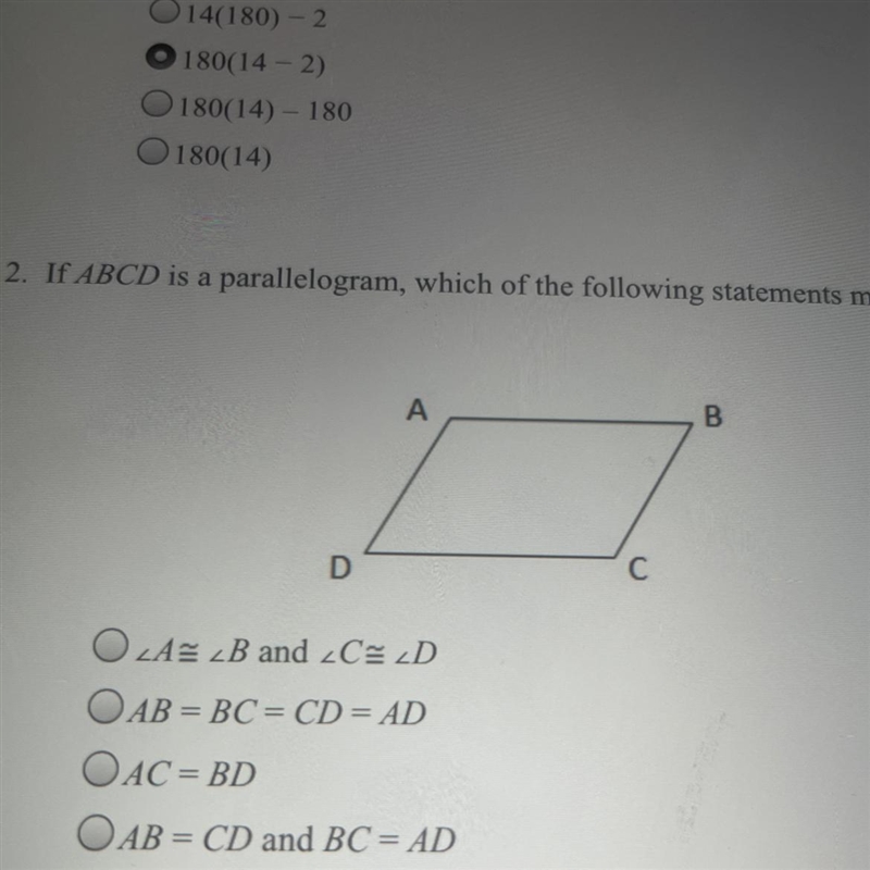 If ABCD is a parallelogram, which of the following statements must be true? AB=BC=CD = AD AC=BD AB=CD and BC = AD