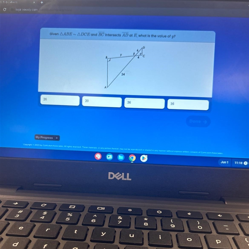 26 Given ABE~ DCE and BC intersects AD at E, what is the value of y? 20 24 36 Ac 16