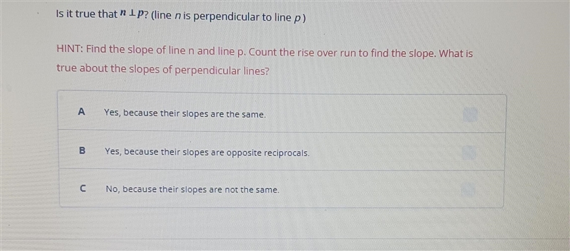 Please help worth 10 points is this true that line n is perpendicular to line p? I think the answer is C, is this correct or not?