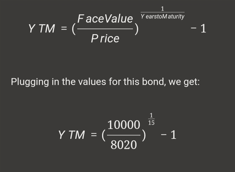 In this case, the bond is a zero-coupon bond, meaning it does not pay periodic interest. Instead, it is sold at a discount to its face value and matures at its face value. The YTM can be calculated using the formula:
