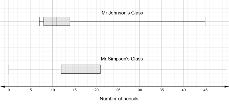 As Mr Simpson's class has a greater IQR and range than Mr Johnson's class, the data in Mr Simpson's class is more spread out than in Mr Johnson's class.