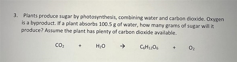 Therefore, if a plant absorbs 100.5 g of water, it will produce approximately 167.5 g of sugar through photosynthesis, assuming it has plenty of carbon dioxide available.