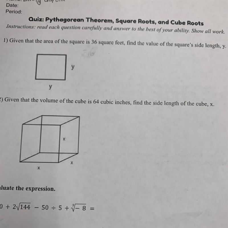 Given that the area of the square is 36 square feet, find the value of the squares side length, y