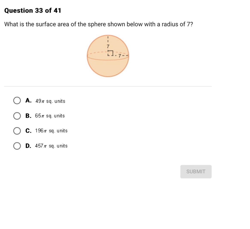 What is the surface area of the sphere shown below with a radius of 7? 1 7 A. 49, sq. units B. 65 sq. units C. 196 sq. units D. 457 sq. units SUBMIT