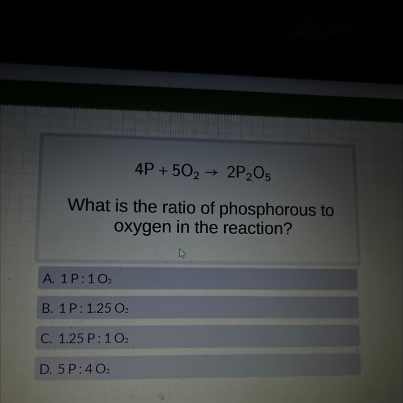 Hence, the ratio of phosphorous to oxygen is 1P:1.25O2 which is option (B)