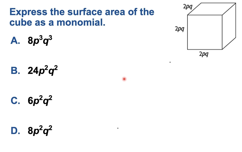 It is given that the length of one side of the cube is 2pq. Plug this into the formula above. We get,