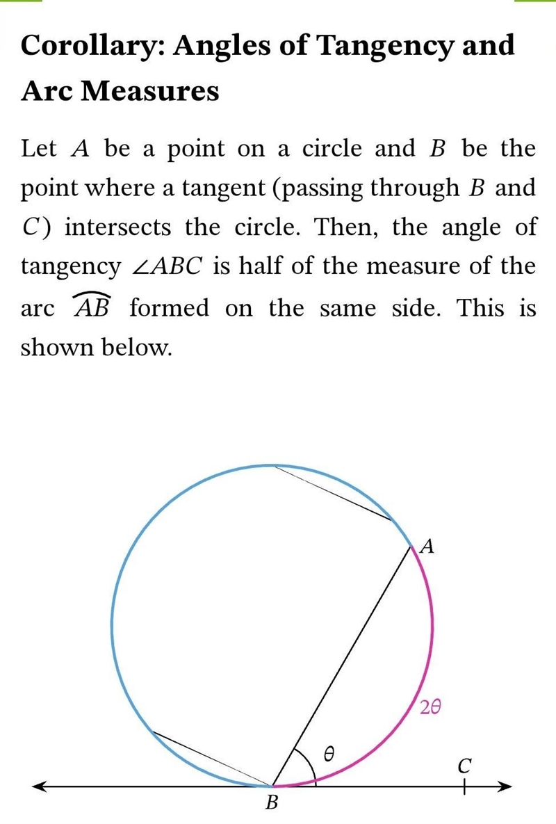 the angle of tangency is half of the measure of the arc formed on the same side.