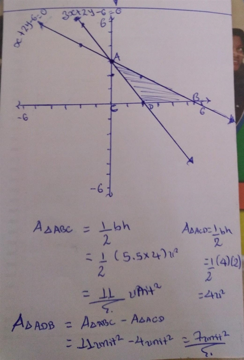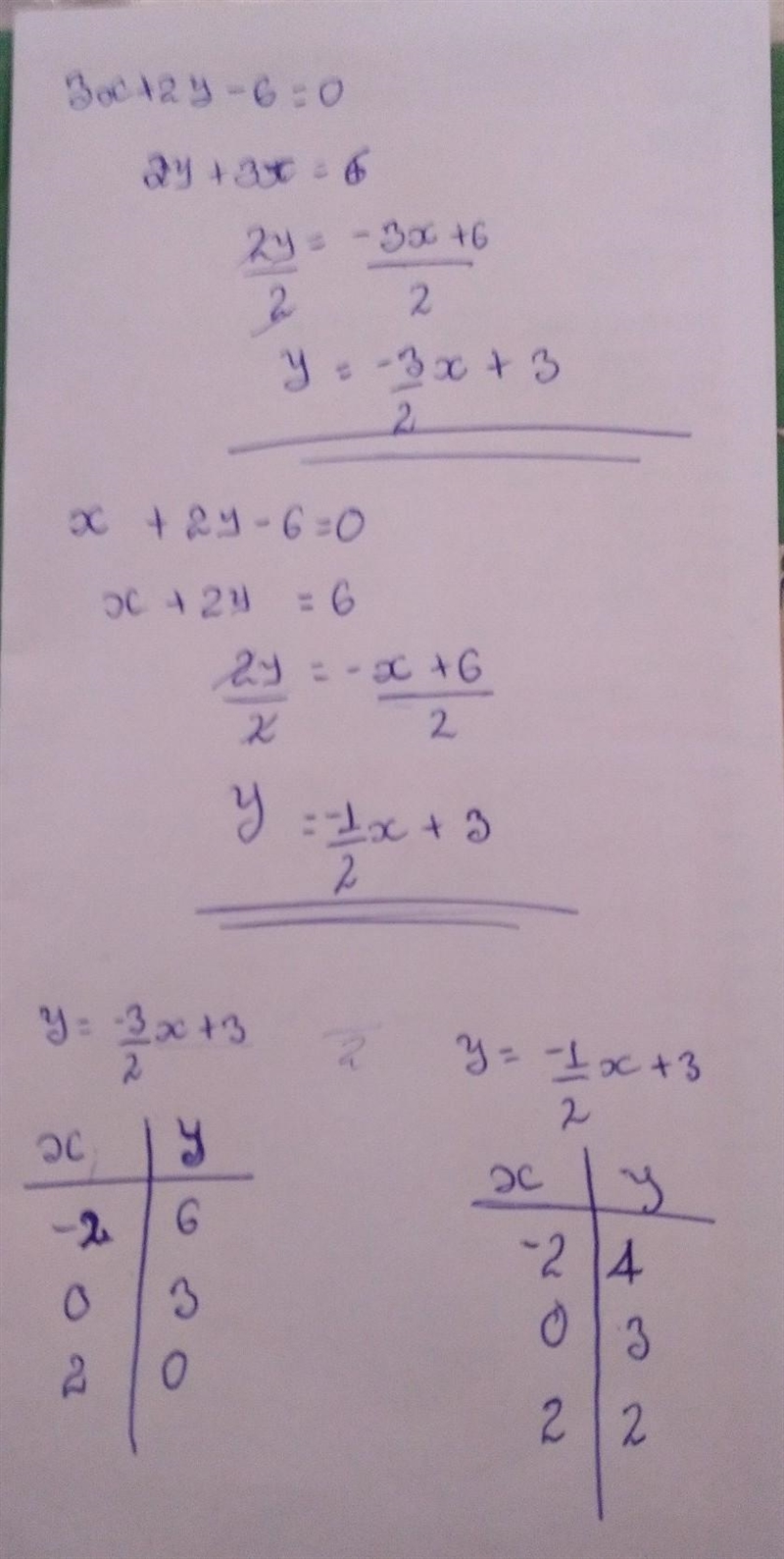 Draw The graph of 2 lines, whose equations are 3x+2y-6=0 and x+2y-6=0 on the same graph paper. Find the area of the triangle