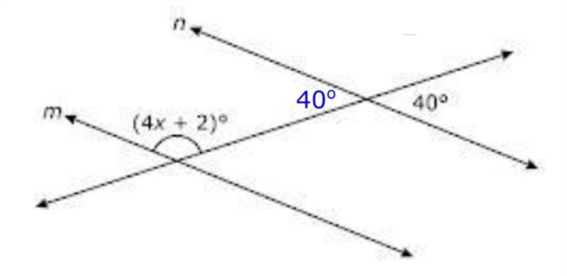 Therefore, the angle labelled (4x + 2)° and the angle vertically opposite to the one labelled 40° sum to 180°: