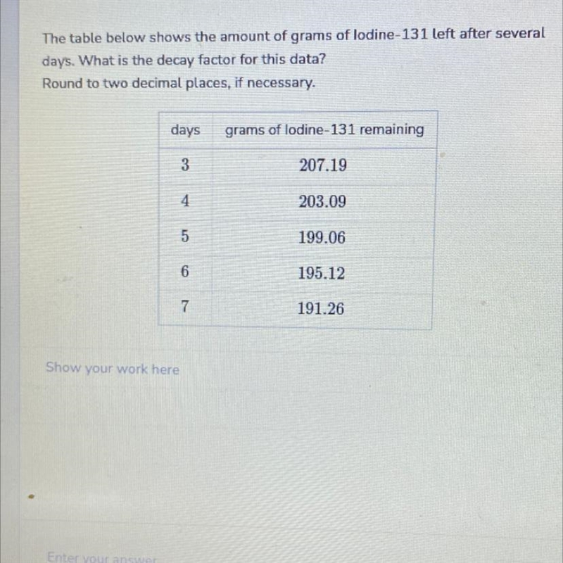 You want the decay factor for the decay of 207.19 grams of I-131 to 191.26 grams in 4 days.