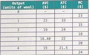 The monthly average variable costs, average total costs, and marginal costs for Alpacky, a typical alpaca wool-manufacturing firm in Peru, are shown in the table below. All firms in the industry share the same costs as Alpacky, and the industry is in long-run equilibrium.