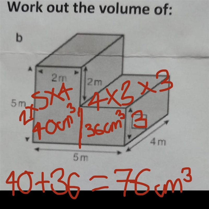 The last step is to add both of these volumes together. The volume of rectangular prism 1 + volume of rectangular prism 2 = Volume of the entire figure. The final volume is 16m + 60m = 76m.