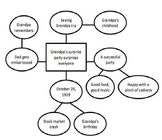 A student made this graphic organizer to help write a narrative essay about his grandfather’s birthday party. Which bubble in the graphic organizer tells the thesis statement of the essay?