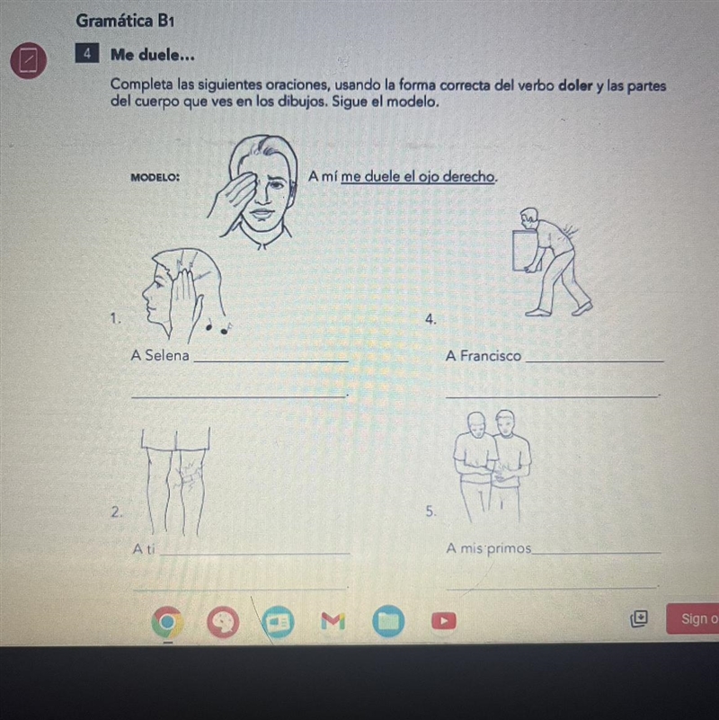 Me duele... Completa las siguientes oraciones, usando la forma correcta del verbo doler y las partes del cuerpo que ves en los dibujos. Sigue el modelo.