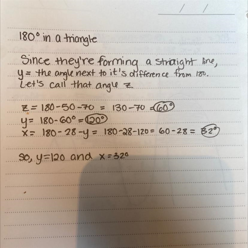 y plus the angle next to it will make 180 degrees since they form a straight line. This means we need to find 180-angle to find y. Let’s call this angle z.