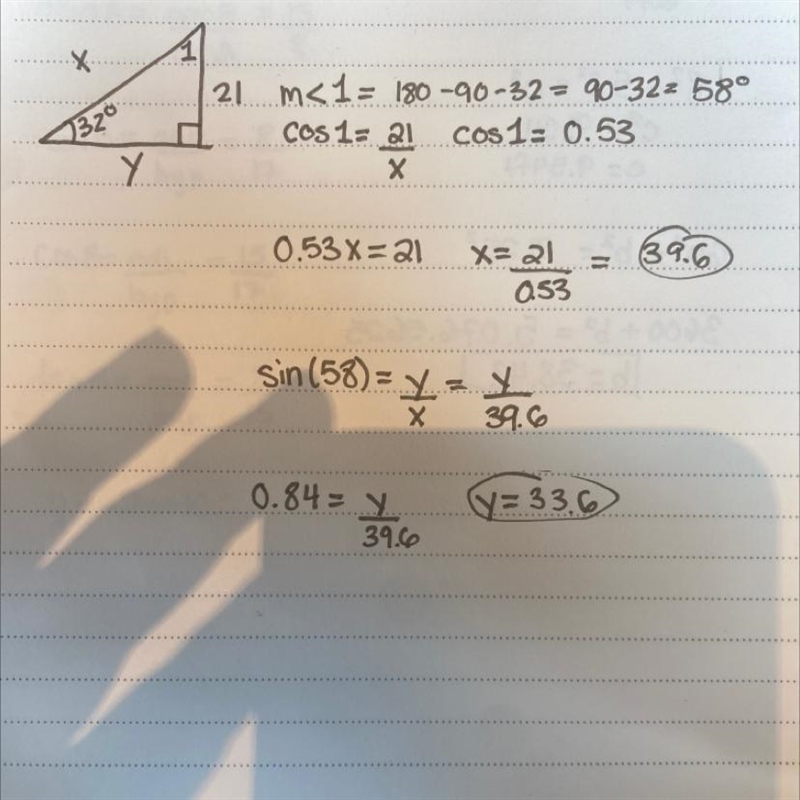 Now, we use trigonometric values of 58 degrees to identify x and y. There are a few ways to do this, but I used cosine and sine. My work is below.