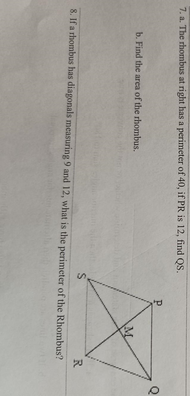 Therefore, given the diagonals of the rhombus are PR = 12 and QS = 16, the area of the rhombus is: