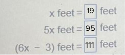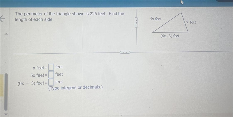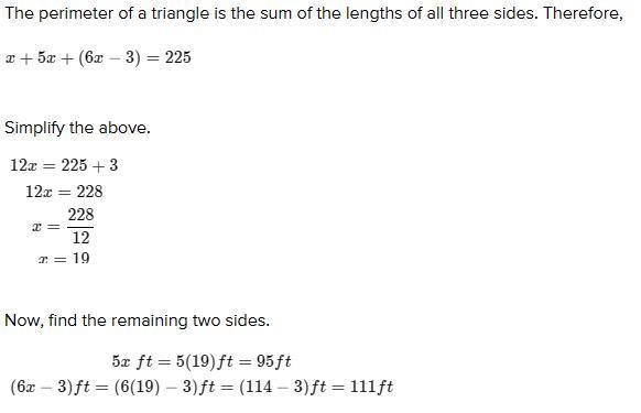 The perimeter of the triangle shown is 225 feet, find the length of each side X feet = How many Feet? 5x feet = how many feet? (6x - 3) feet = for many feet?