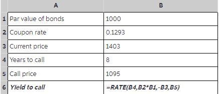 What is the yield to call of a 30-year to maturity bond that pays a coupon rate of 12.93 percent per year, has a $1,000 par value, and is currently priced at $1,403? The bond can be called back in 8 years at a call price $1,095