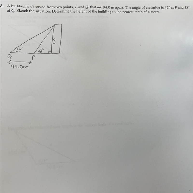 We have two right triangles, one at point P and another at point Q. The opposite side of each triangle represents the height of the building (h), and the adjacent side represents the distance from each observation point to the base of the building.