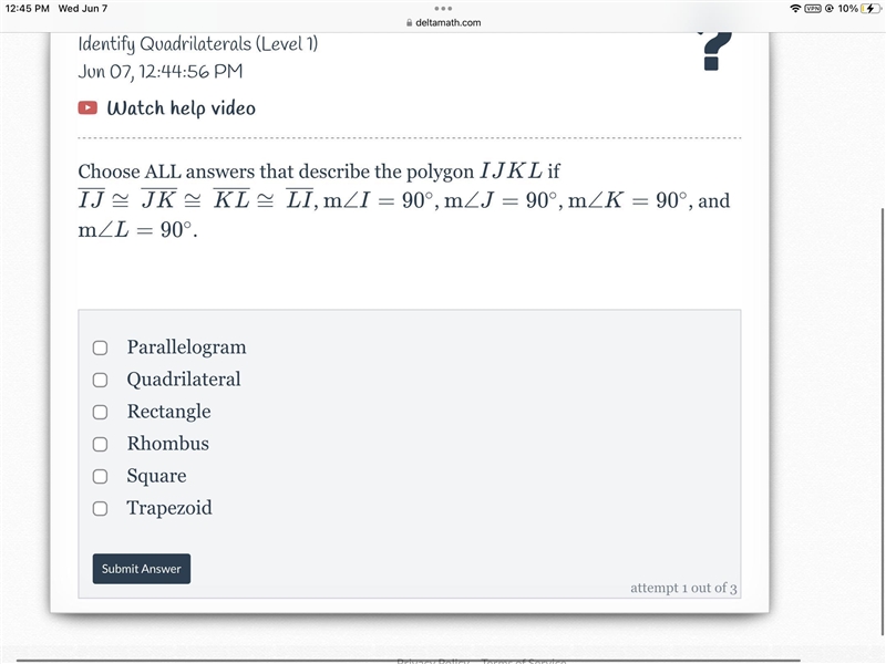 m/I = 90°, m/J = 90°, m/K = 90°, and m/L = 90°: This indicates that all angles of the polygon are right angles.