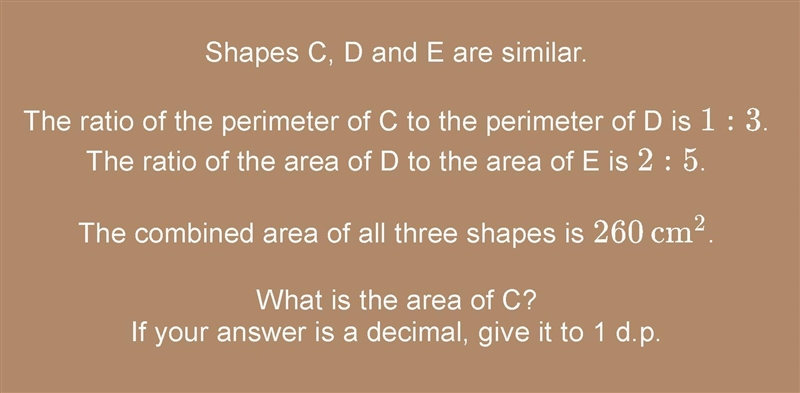 You want the area of shape C if the ratios of perimeters of similar shapes C, D, E are C:D = 1:3 and D:E = 2:5, and the total area is 260 cm².