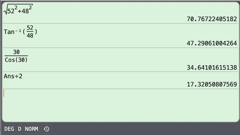 A = arctan(52/48) ≈ 47.3°