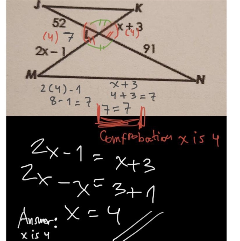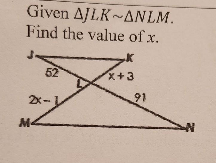 Please help: Given triangle JLK is similar to triangle NLM. Find the value of x.