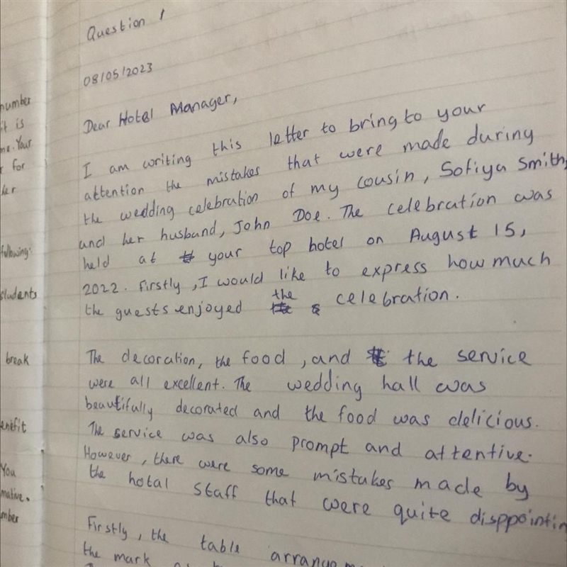 hotel. The celebration was enjoyable but the hotel made some mistakes. You decide to write a letter to