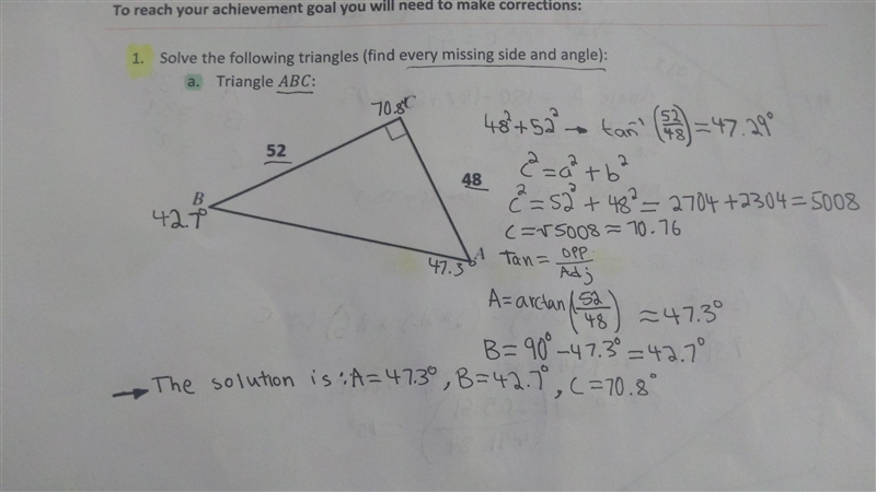 Thus, as you've written, we can find c by plugging in 52 for and 48 or b in the Pythagorean Theorem. Then, we'll take the square root of the sum of squares of 52 and 48 to find c, aka side BA (the hypotenuse):