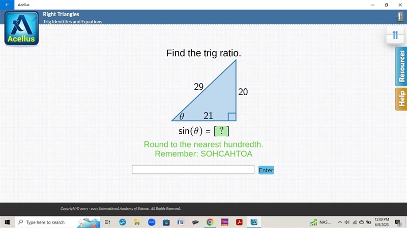 the sine of angle θ in the right triangle is 20/29.