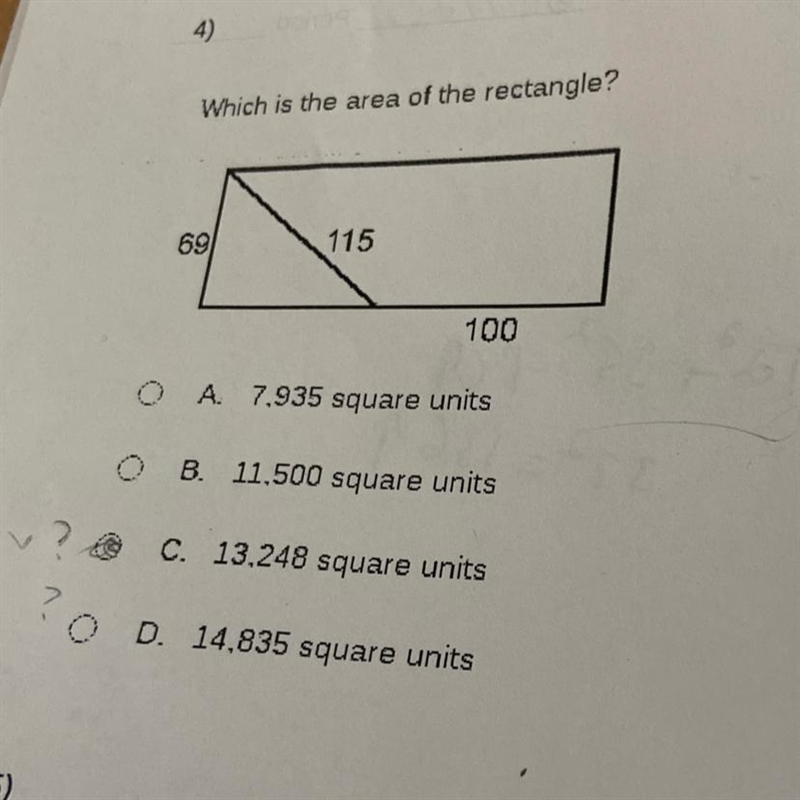 You need to use the Pythagoras theorem to find the missing side.a^2+b^2=c^2c^2-a^2=b^2115^2-69^2=92^292+100=192192*69=13,248