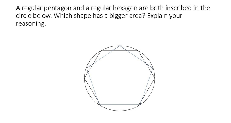 A regular pentagon and a regular hexagon are both inscribed in the circle below. Which shape has a bigger area? Explain your reasoning. 4