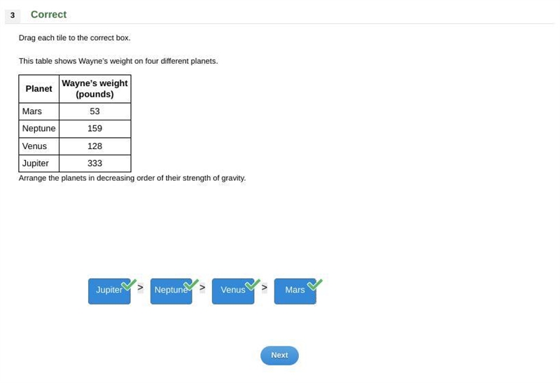 So, the planets arranged in decreasing order of their strength of gravity based on Wayne's weight are: Jupiter, Neptune, Venus, and Mars.