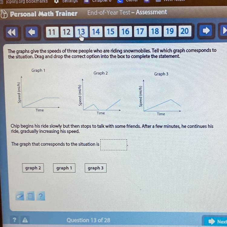 On graph 2, the line goes slowly up along the y value, meaning that his speed is increasing. (Chip begins his ride slowly)