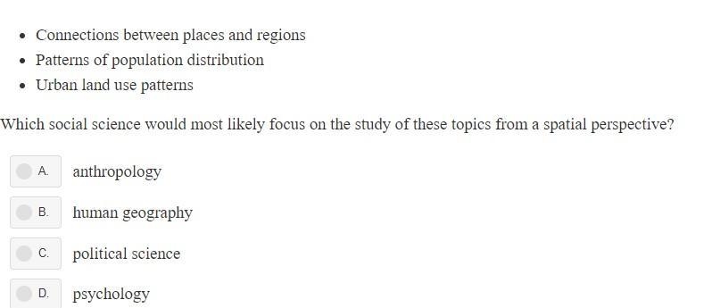 human geography. took this class last year and learned this. psychology is the human mind/emotions, anthropology is human body, and political science is politics