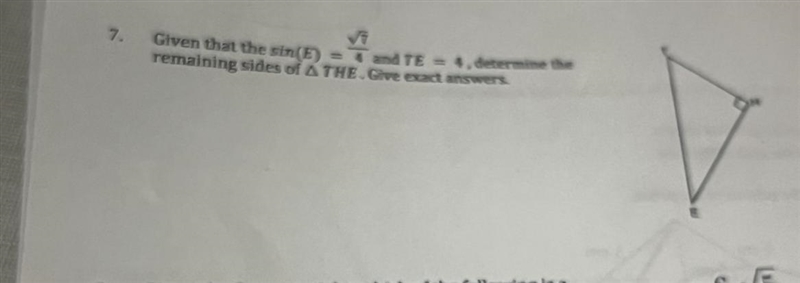 To determine the remaining sides of triangle THE given that sin(E) = 4 and TE = 4, we can use the sine ratio.