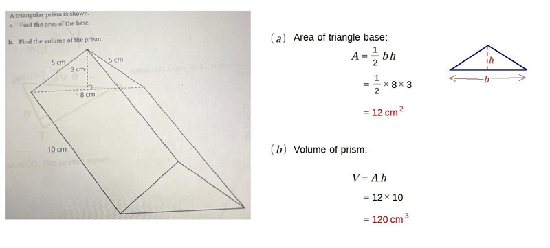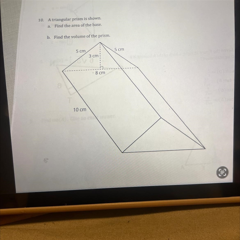 10. A triangular prism is shown. a. Find the area of the base. b. Find the volume of the prism. d 5 cm 10 cm 3 cm 8 cm 5 cm