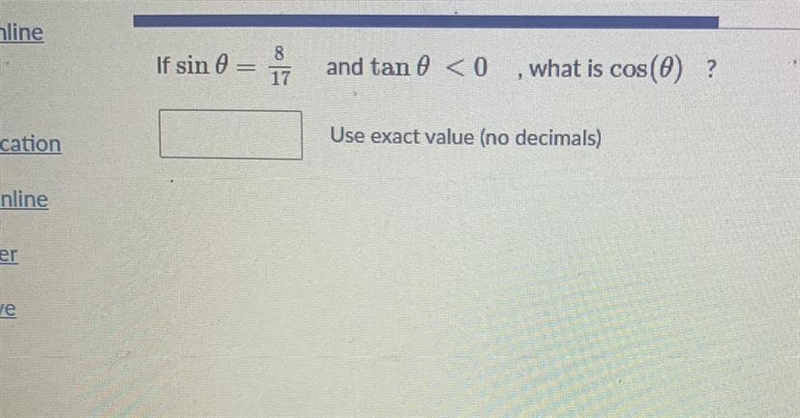 If sin 0=8/17, and tan0<0, what is cos(0) Use exact values. No decimals. (0 means-example-1