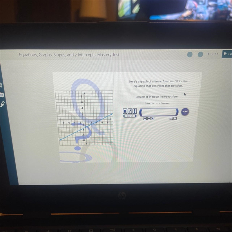 Step-by-step explanation: The y-intercept is -3 just by looking at the graph and the slope can be determined by rise over run for the points that lie on the line.