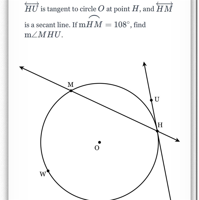 the angle MHU between the tangent and the secant is half the measure of the intercepted arc HM , then