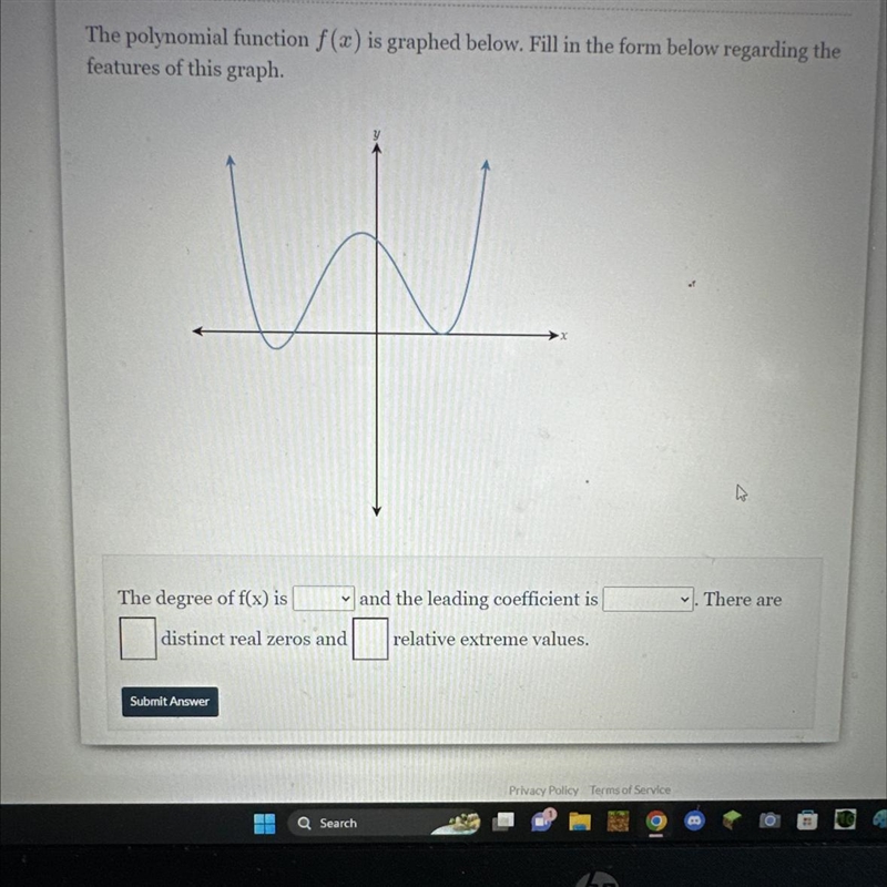 The degree is 4 the leading coefficient is even/positive. There are 3 distinct real 0's and 3 relative extreme values