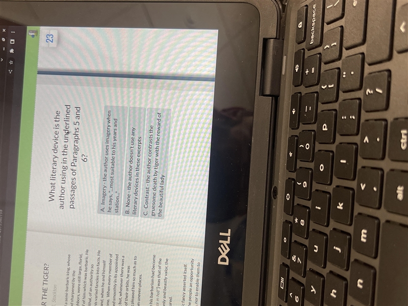 Explanation:The literary device used in the underlined passages of Paragraphs 5 and 6 in "The Lady or the Tiger?" is **foreshadowing**. Foreshadowing is a literary device that hints at events that will happen later in the story. In these passages, the author foreshadows the two possible outcomes of the young man's choice: death or love.